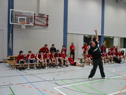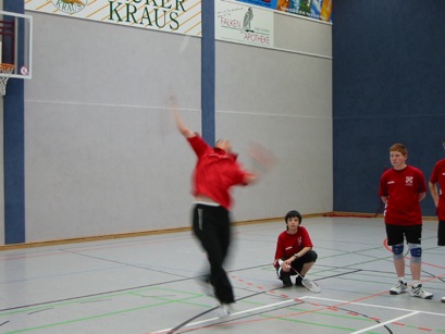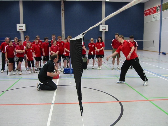 Das in erster Linie an Kinder und Jugendliche gerichtete Angebot wurde aber auch von einigen interessierten Erwachsenen aus der Badmintonabteilung genutzt, weil es gelungen war, zwei Spitzen – Trainer/Spieler des in die erste Bundesliga aufgestiegenen Badmintonvereins TV Refrath e.V. für das 2-tägige Trainingscamp zu gewinnen. Betreuer/Trainer Heinz Kelzenberg und der diesjährige Dritte der deutschen Badminton – Meisterschaft Kai Waldenberger gestalteten für die zahlreichen Teilnehmer zwei ereignisreiche und vor allem lehrreiche Tage mit einem tollem Programm: