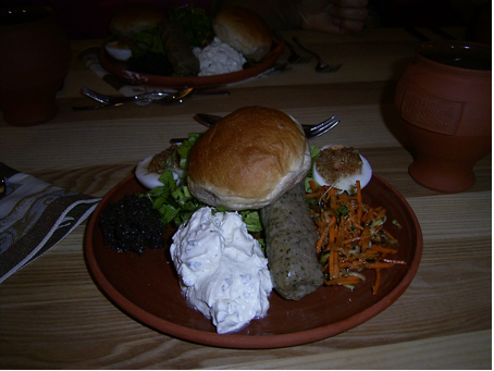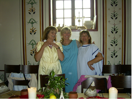 Zum Mittagessen ging es im Römergewand weiter. Kulinarische Delikatessen, zubereitet wie zu Römers Zeiten mussten probiert werden. Das waren z.B. ein gewöhnungsbedürftiger Gewürzwein, der irgendwie nach Weihnachtspunsch schmeckte oder eine besondere Vorspeise, die „Diversis Gustus“, eine gemischte Vorspeisenplatte mit Lukanischen Würstchen, Moretum, Vorgemüse und Olivenpaste.