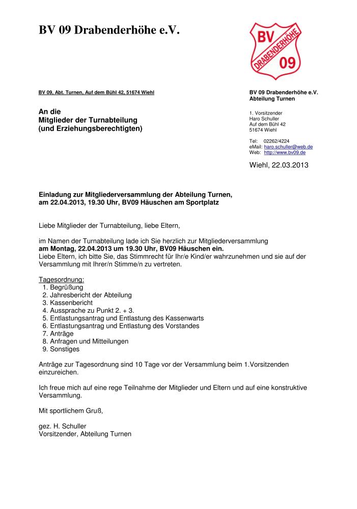 Anträge zur Tagesordnung sind 10 Tage vor der Versammlung bei der 1. Vorsitzenden einzureichen.