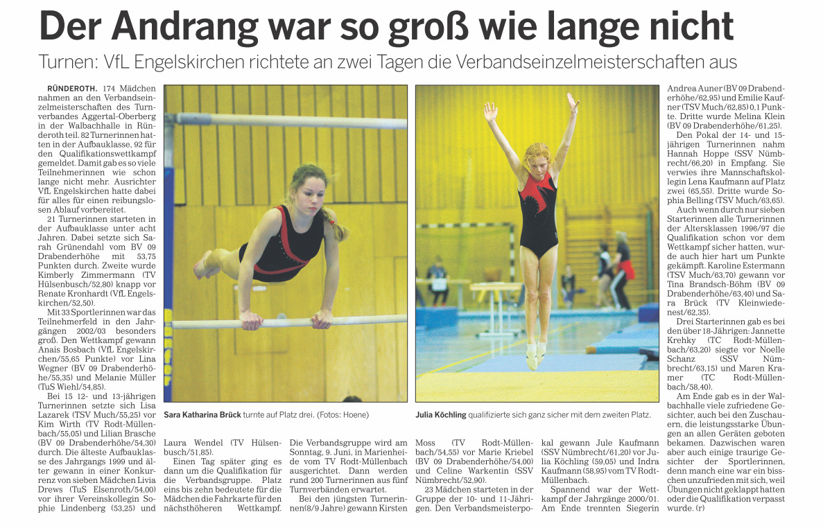 Die ersten 10 Turnerinnen qualifizieren sich für die Verbandsgruppe, die am 9.06. in Marienheide vom TV Rodt-Müllenbach ausgerichtet wird. Dann werden rund 200 Turnerinnen aus fünf Turnverbänden erwartet.