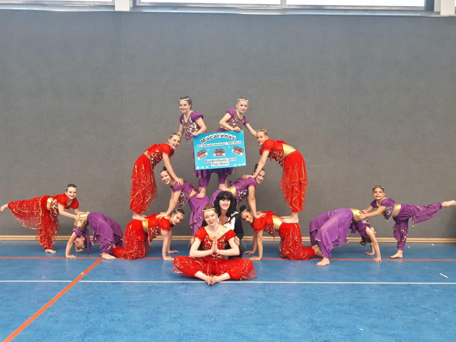 Am Samstag ging es bereits sehr früh mit den Vorbereitungen für den Vorentscheid los, denn der Zeitplan war sehr eng bemessen. Um 10.30 Uhr fand bereits die Stellprobe statt. In den 1,5 Stunden zwischen der Stellprobe und dem Vorentscheid wurden die letzten Vorbereitungen getroffen. Um 12 Uhr ging die Show in einer gefüllten Halle mit etwa 1500 Zuschauern los. Alle 19 Gruppen stürmten auf die Bodenfläche, um gemeinsam den eingeübten Flashmob zu präsentieren. Nach der Begrüßung und Vorstellung der Gruppen, blieben erneut etwa 1,5 Stunden bis zu unserem Auftritt, die sinnvoll zum Aufwärmen und Üben genutzt wurden. Um ca. 13.46 Uhr war es nun soweit, die Macarenas durften ihren Showtanz „Bollywood“ vorführen. Es lief beinahe alles fehlerfrei. Selbst die Jury war von den auffallenden und klimpernden Kostümen, der Choreographie und der bezaubernden Musik entzückt. Die Macarenas erhielten ein positives Feedback diesbezüglich und landeten unter den 10 besten Showgruppen von ganz Deutschland. Das Highlight des Abends war, dass die Macarenas den Showabend der Sieger eröffnen durften, wo sie ihr Können erneut bewiesen und viel Applaus vom Publikum ernteten. Trotz eines langen und vor allem anstrengenden Tages wurde auf der anschließenden TUJU-Starts Party ausgiebig getanzt und gesungen.