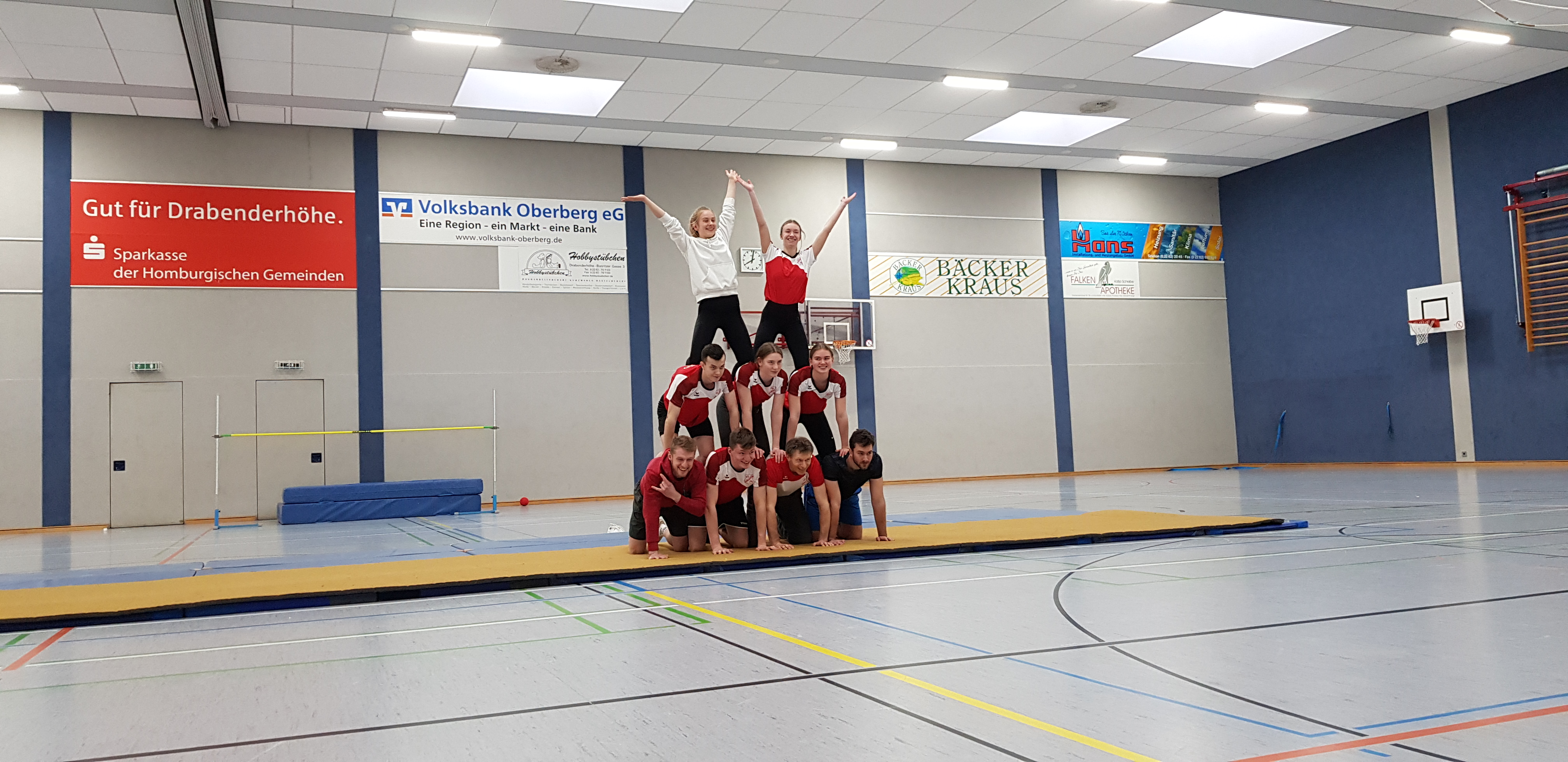 Bei der internen Generalprobe am 30.01.2022 zeigt Kurs 16, Trainerstab und Trainer den Gästen eine Pyramide zum Abschluss des Programms
