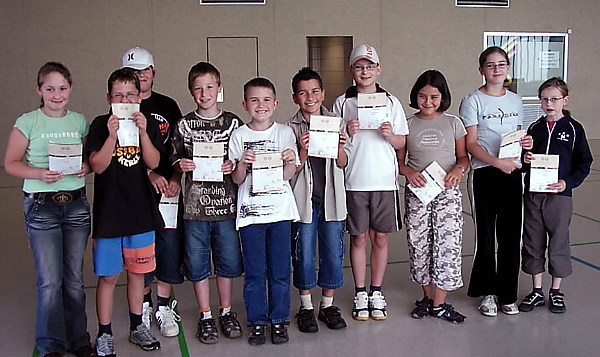 Für die ehemaligen 4. Klassen der Grundschule in Drabenderhöhe, wurde eine kleine Übergabe-Feier auf den 18.8.2007 gelegt. Zu diesem Termin wurden dann auch die ersten Sportabzeichen des Jahres 2007 übergeben. Leider hatten viele die zwei Trainingstermine in den Ferien und auch die zwei Termine nach den Ferien nicht wahrnehmen können, so dass letztlich nur 11 Abzeichen übergeben werden konnten.