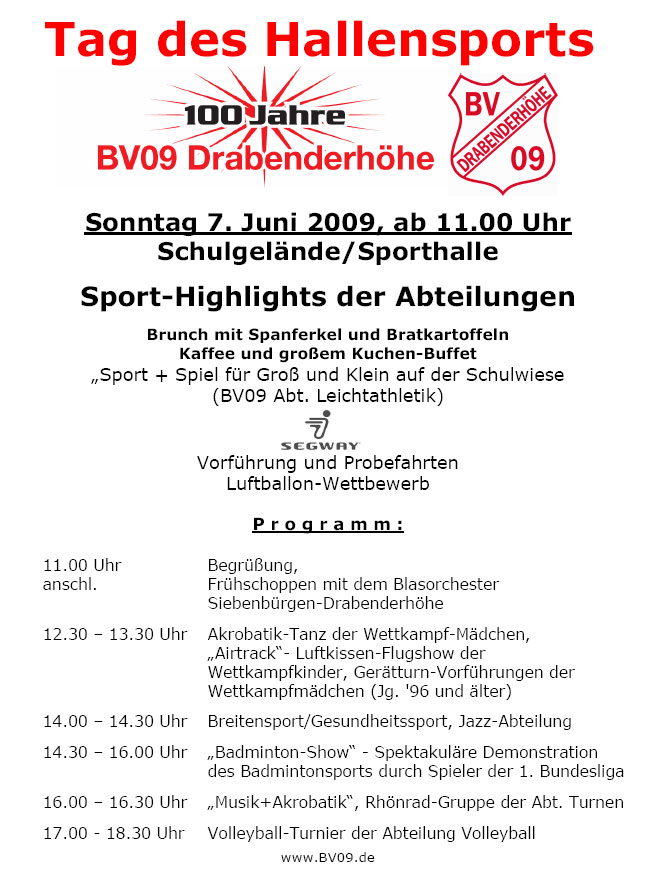 Der Tag des Hallensports, anlässlich des 100-Jährigen Bestehens der BV09, war eine spannende, unterhaltsame und sportliche Werbeveranstaltung im besten Wortsinn. Die Sportlerinnen und Sportler präsentieren die Hallensportarten des Vereins vor begeistertem Publikum und machten vor allem Appetit. Appetit und Lust auf Sport und Bewegung in einer der Abteilungen des BV09 Drabenderhöhe.